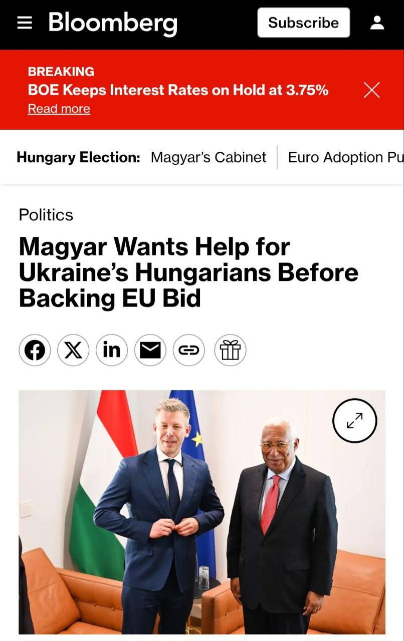 Мадьяр потребовал расширить права венгров в Украине до переговоров о вступлении в ЕС, — Bloomberg со ссылкой на источники