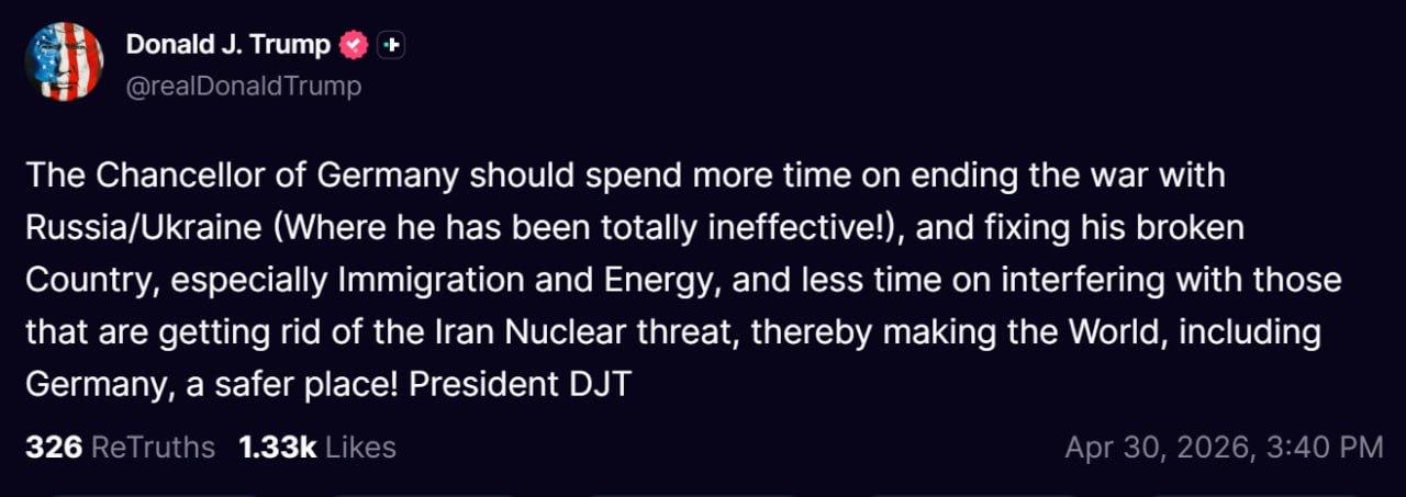 Канцлеру Германии стоит тратить больше времени на завершение войны между Россией и Украиной [нежели на конфликт в Иране], в чем он до сих пор был совершенно неэффективен! — Трамп