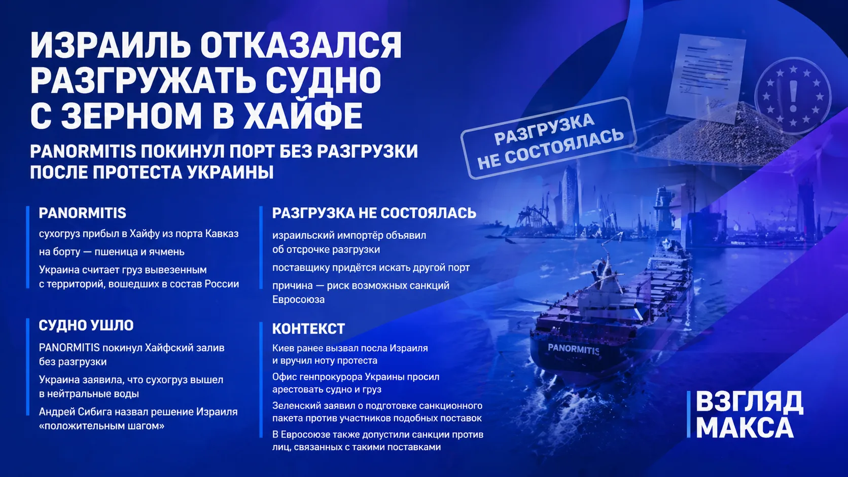 Сухогруз PANORMITIS прибыл в порт Хайфы из порта Кавказ с грузом пшеницы и ячменя. Однако после обращения украинской стороны разгрузка не состоялась. По данным израильского телеканала N12, компания-импортёр «Ценципер» объявила о вынужденной отсрочке разгрузки и сообщила, что поставщику придётся искать другой порт.